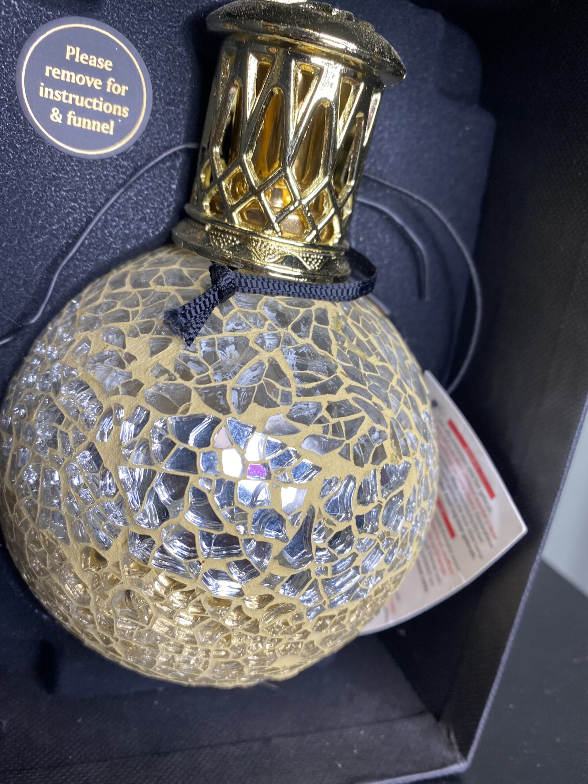 Ashleigh & Burwood small fragrance lamp Little Treasure is een met de hand gemaakte lamp van stukjes mozaïek. De lamp is in de kleuren goud, zilver en heldere stukjes mozaïek. De lamp word perfect afgemaakt met een goud kleurige sier dop.