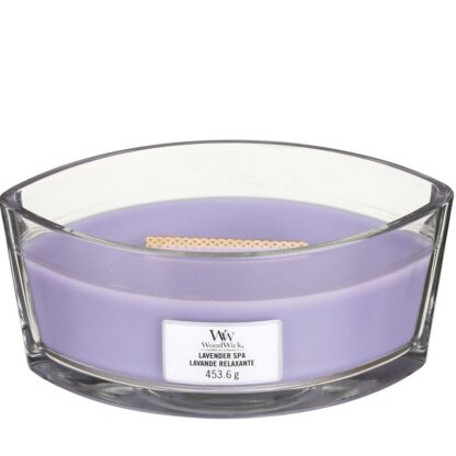 WoodWick Lavender Spa neemt u mee naar een broodnodige spa/welness dag met de ontspannende geur van speciaal samengestelde lavendel en eucalyptus oliën.